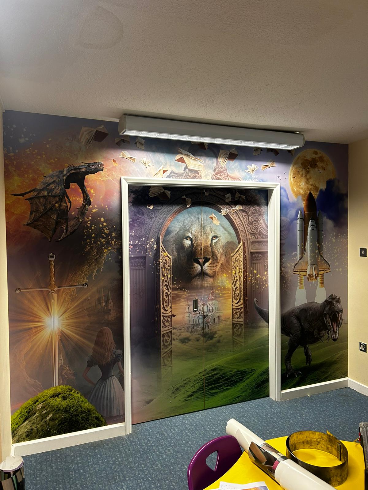 We also transformed the sliding doors to the library with a ‘Narnia’ inspired image. The idea is to pique curiosity and entice pupils towards the space.