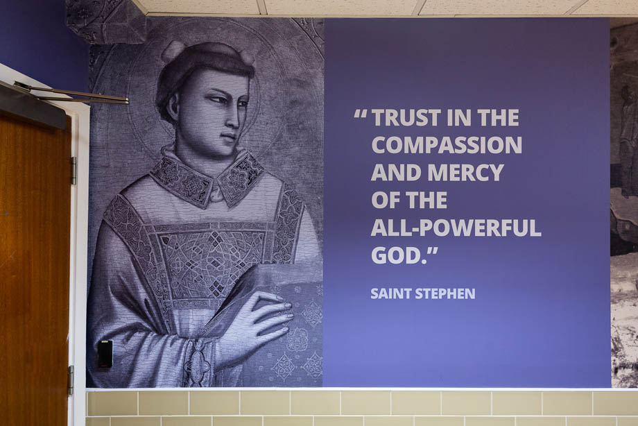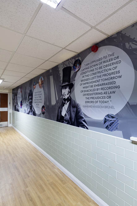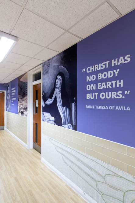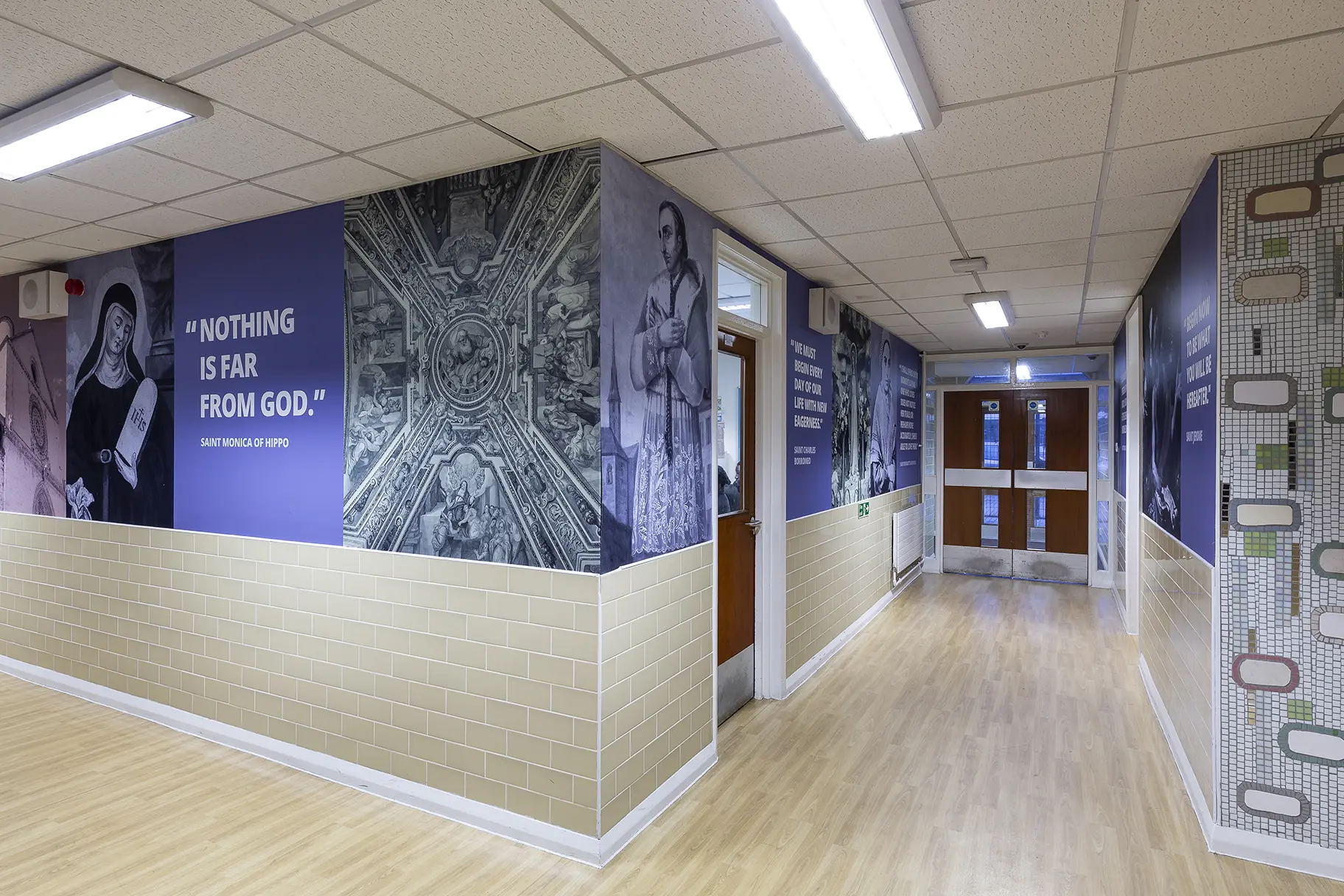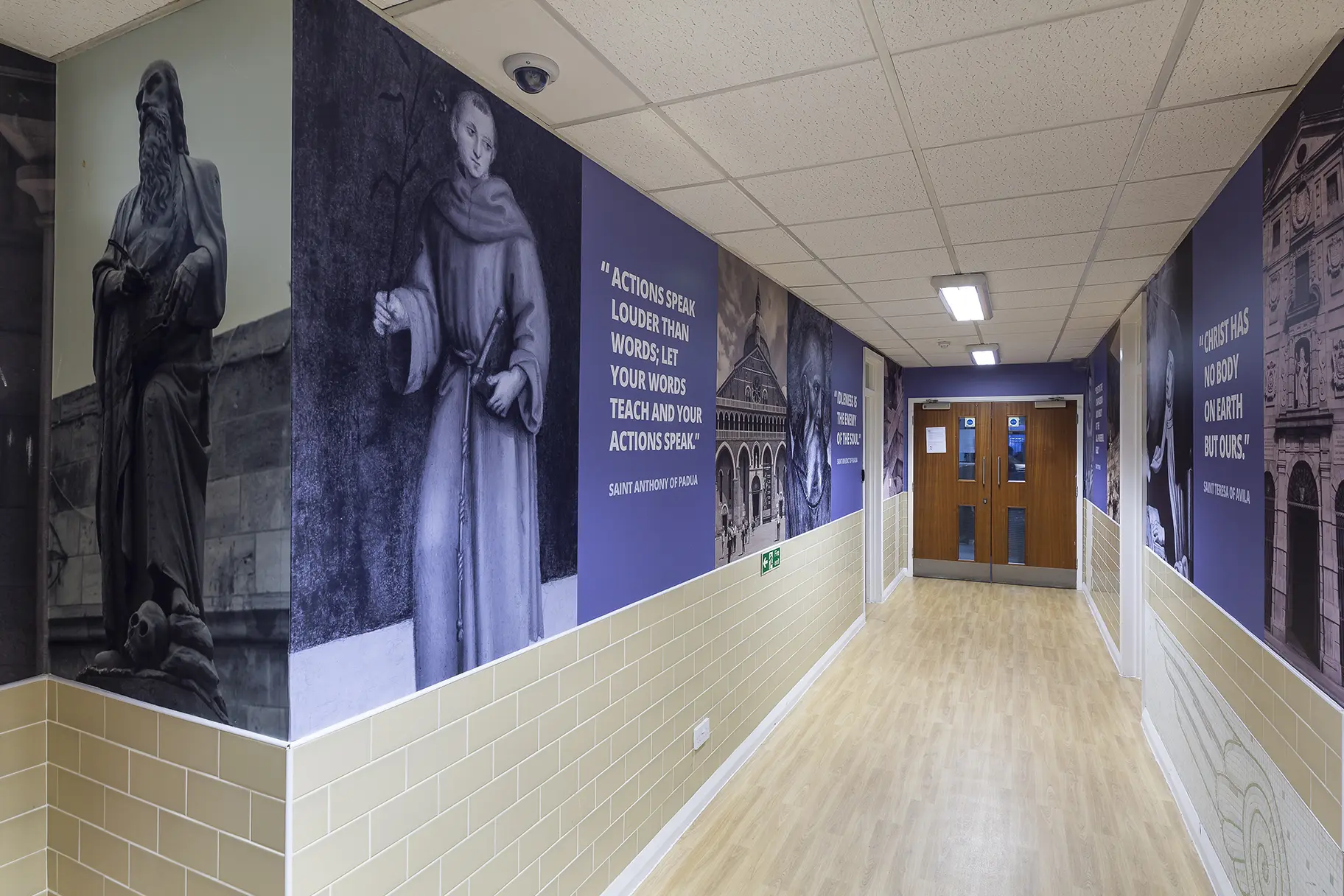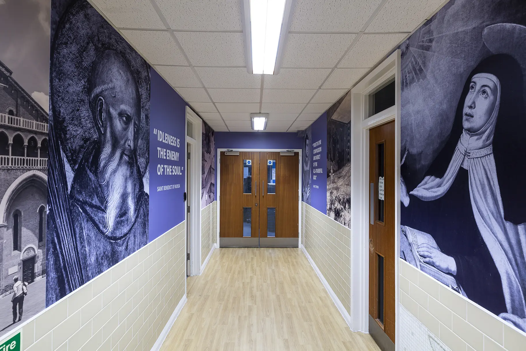These Sixth Form Corridors feature bespoke Wall Art. We’ve incorporated images and inspirational quotes across various subjects. There’s also a nod to the school’s Catholic Faith and values system. So the design provides a well rounded visual guide for students as they make their way through the corridors.