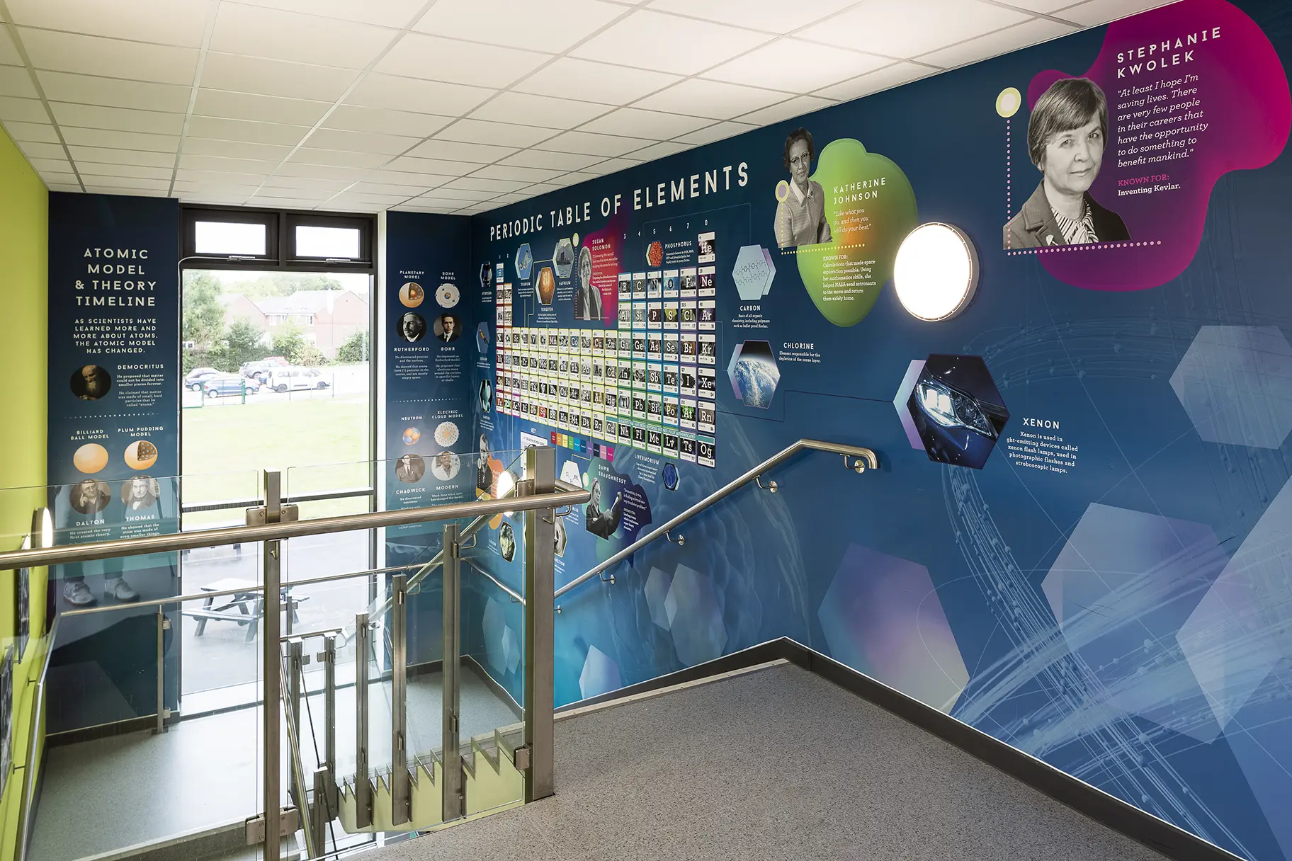 Chemistry Wall Art is a wonderful resource to spark a genuine interest in the subject. And, this beautiful and sleek design has also transformed the stairwells at Chailey School.