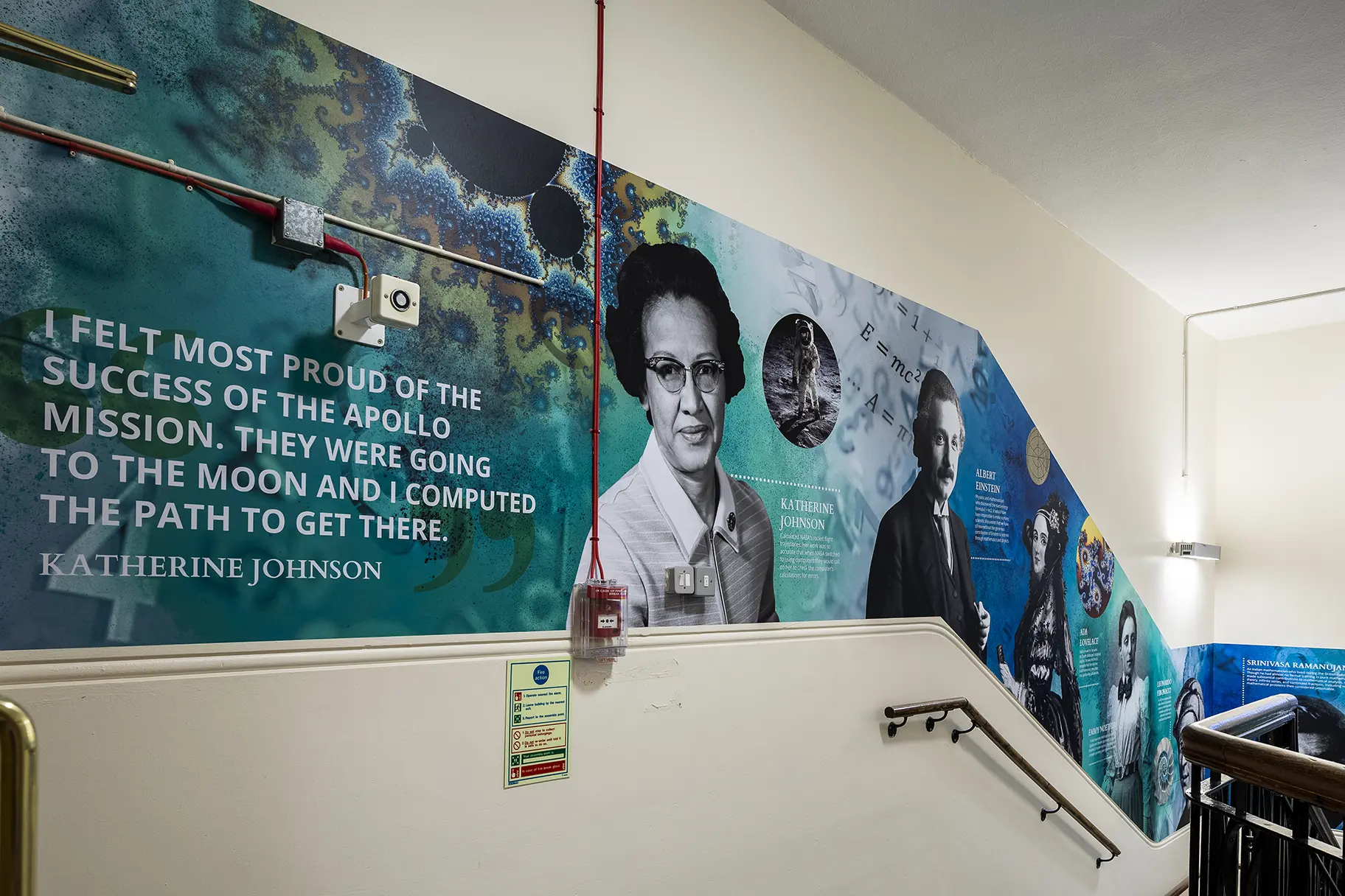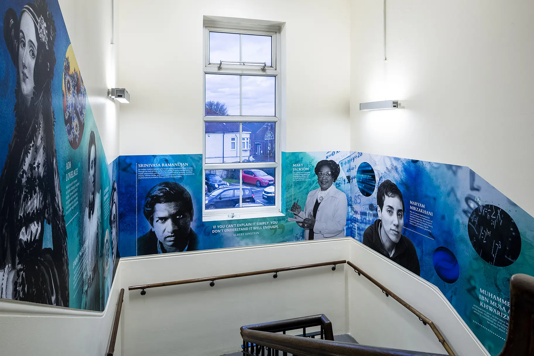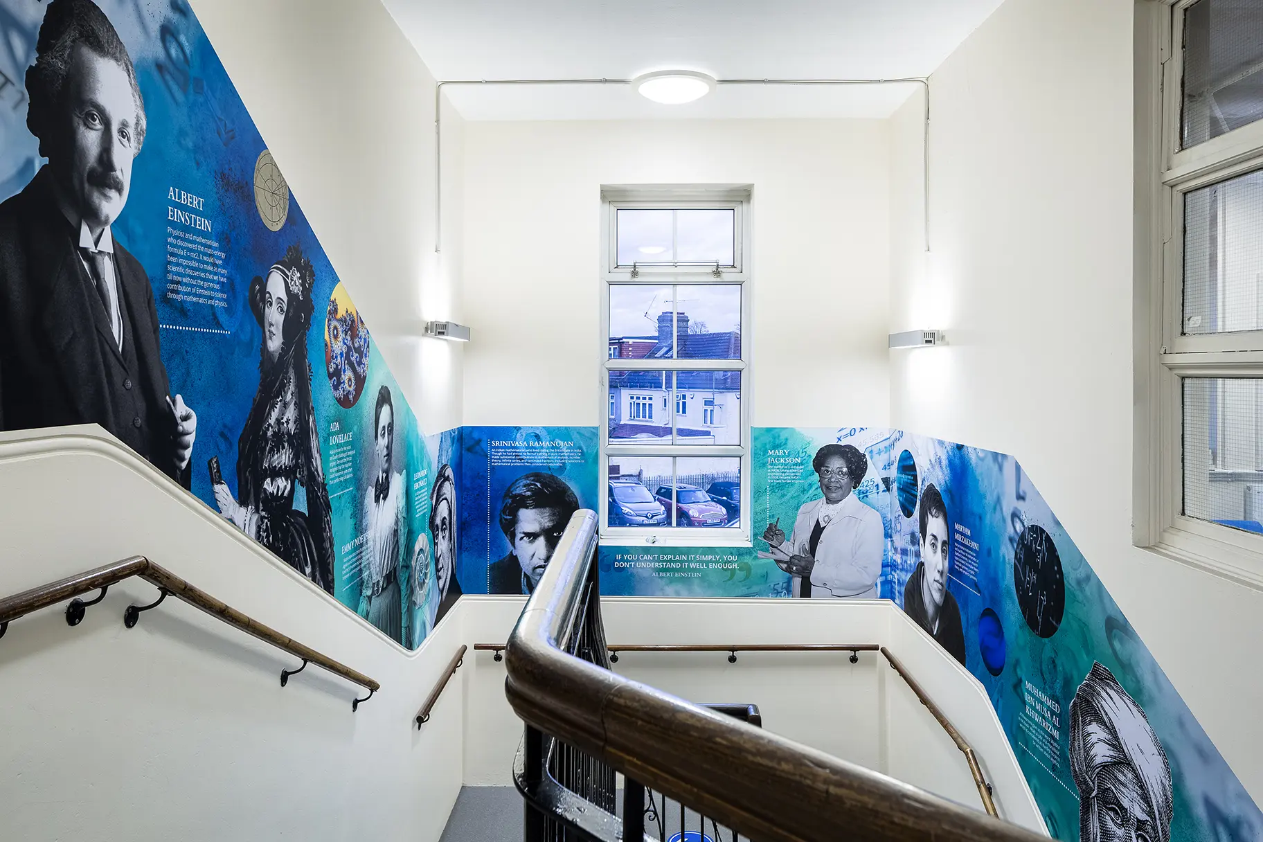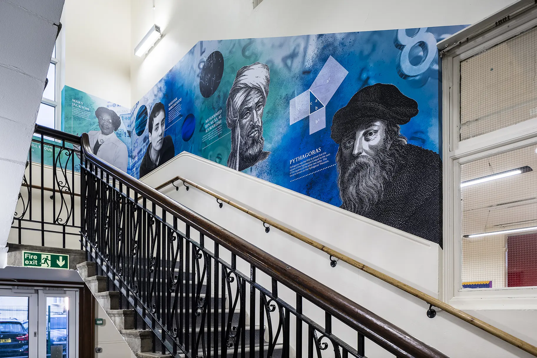 A High School Maths Stairwell is a fantastic resource to stimulate curiosity in the subject. We created this design for Ilford County High School in London. It features a selection of Mathematicians who made a huge impact on humanity.