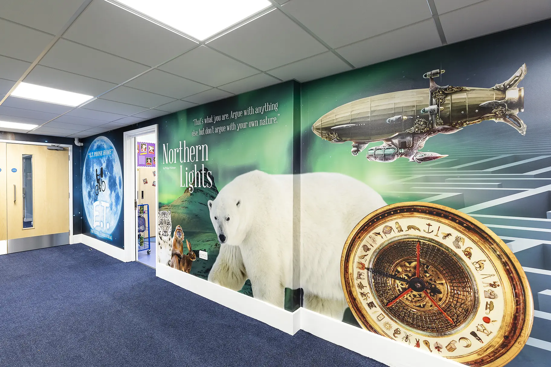 This Year 5 Literacy Corridor features astounding images from setbooks within the school’s curriculum. We’ve worked with Lee Chapel Primary Schools many times before. So we know that they have a big commitment to creating a positive learning environment for pupils.