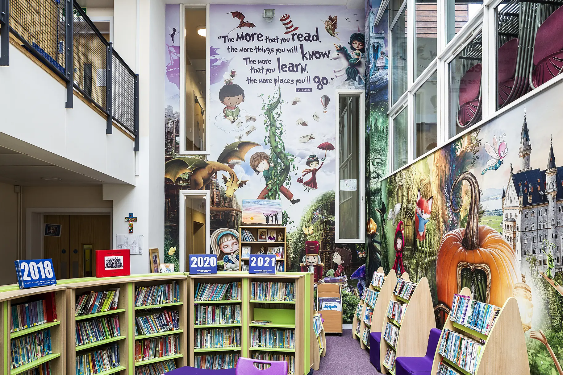 A Primary School Library can be a place of wonder and escapism for pupils. It should be warm, welcoming and comfortable. And the visual surroundings are equally important.