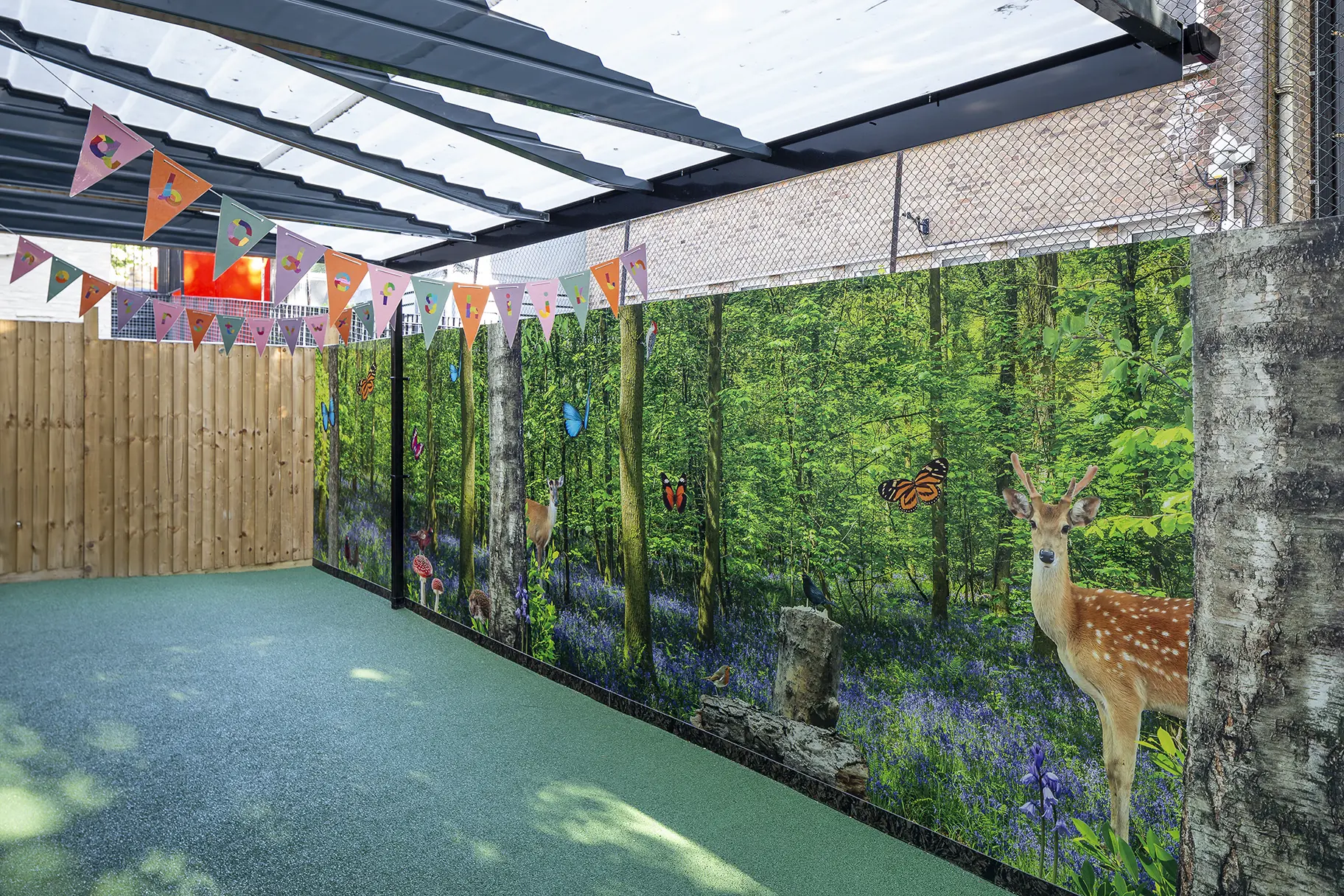 We were delighted to design an Outdoor Woodland Wall Art theme for the nursery’s play area. A nature theme is the perfect way to add an air of escapism to a bustling city centre location.
