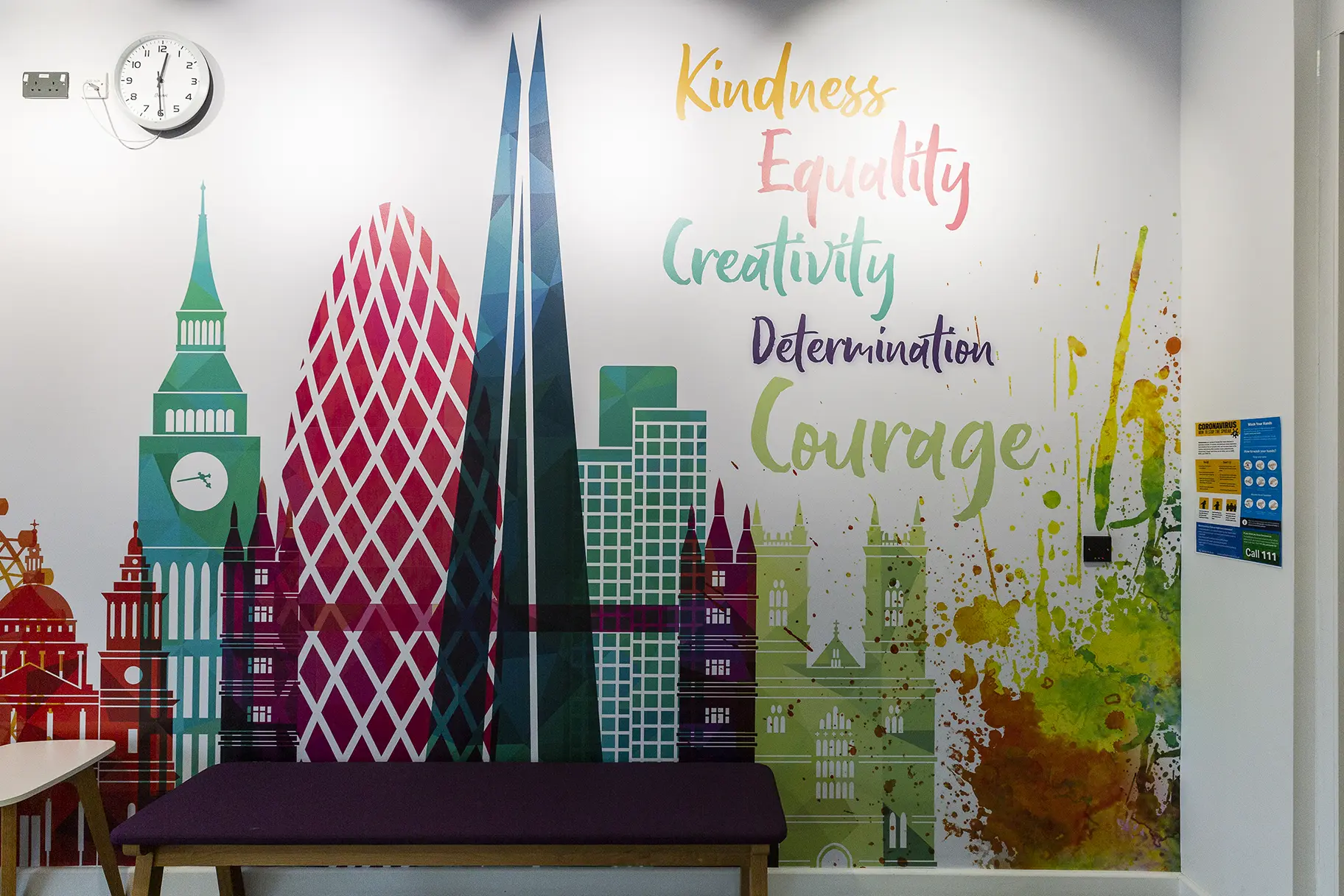 The school’s values are ‘Kindness, Equality, Creativity, Determination and Courage’. And these values are celebrated in the reception area of Plumcroft Primary School. We were certainly proud to use these values as a base for the school’s bespoke Wall Art design.