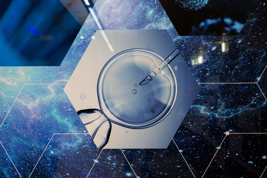 This stunning Reception Wall Art makes a bold first impression for visitors. And it is a great reminder of the groundbreaking research that takes place within the building.