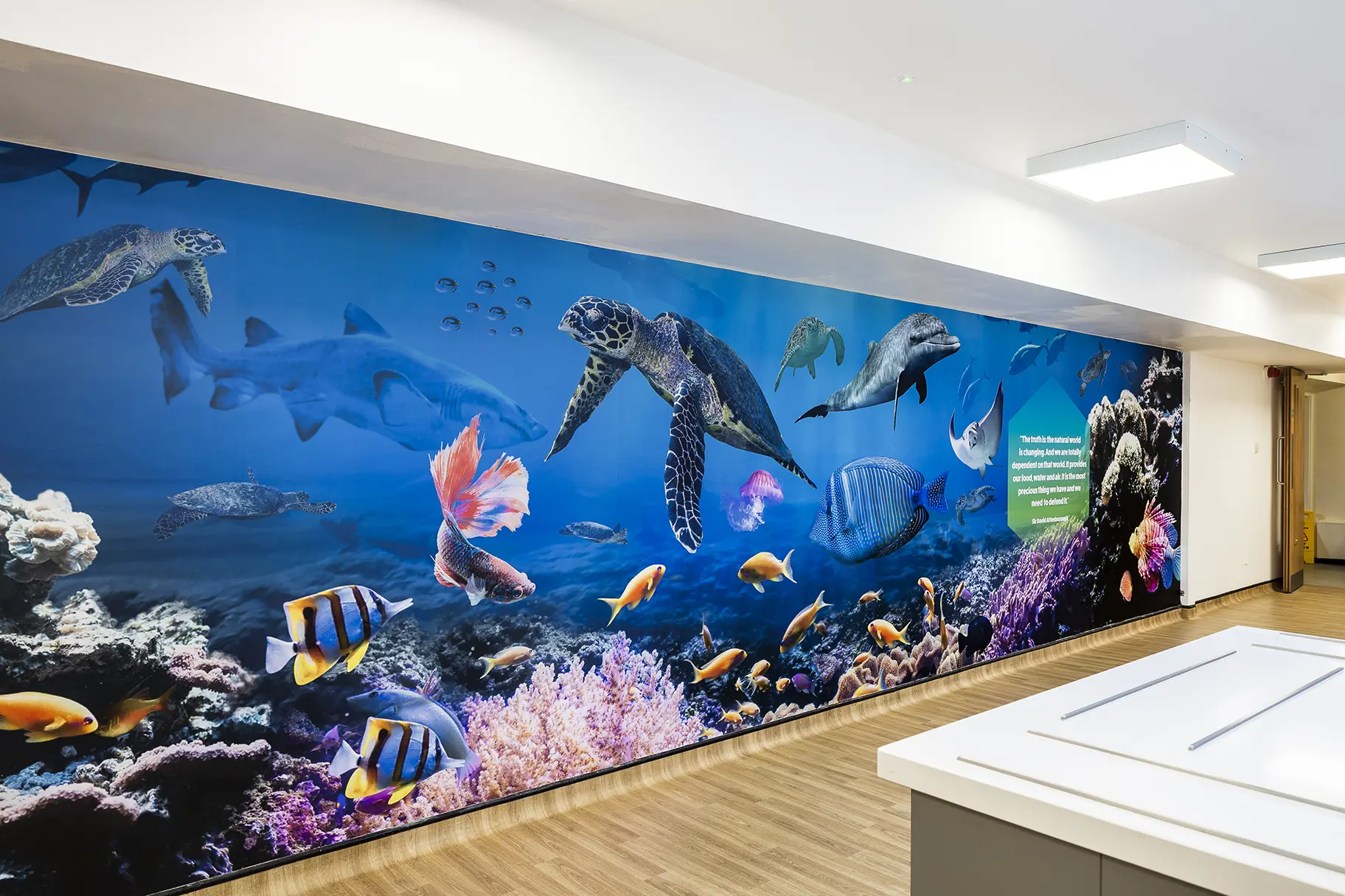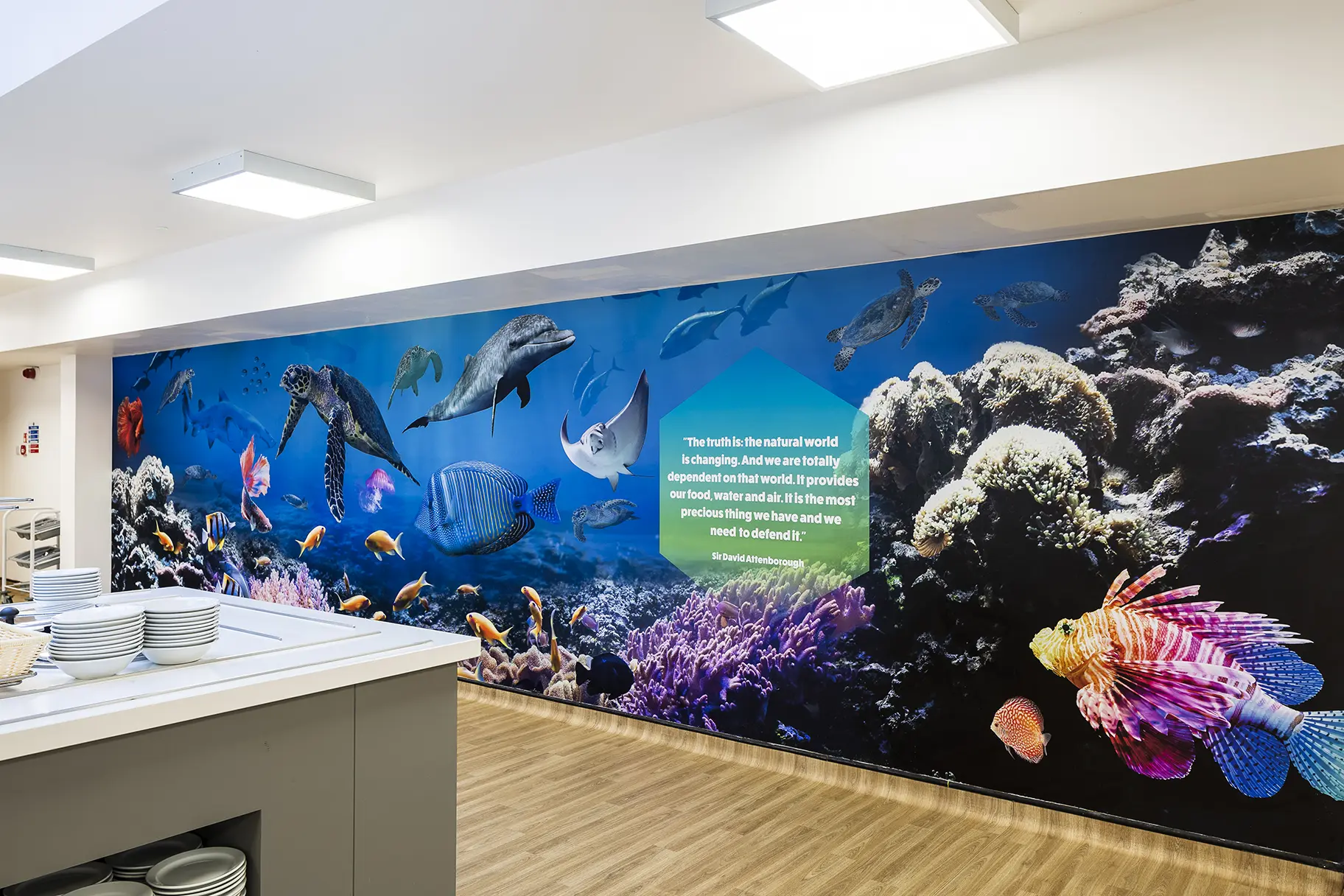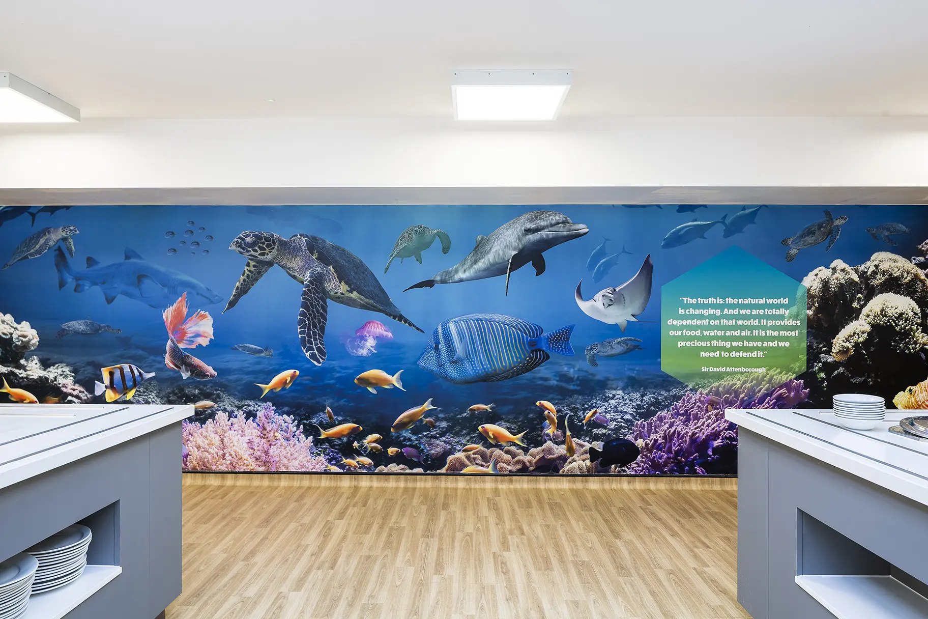 The Ratcliffe College Canteen celebrates the natural world in this stunning underwater design. It’s a wonderful addition to the canteen at this Independent School in Leicestershire.