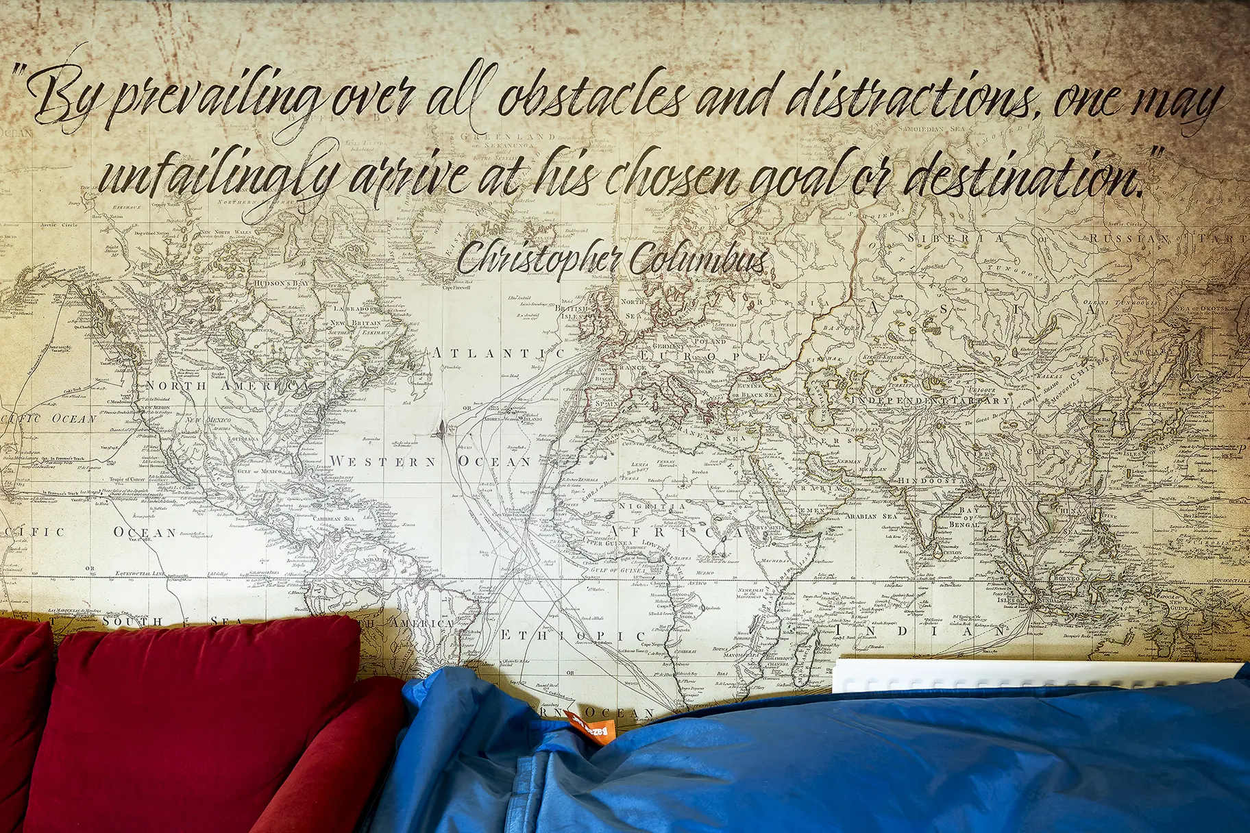 There’s an air of adventure within this Boarding House art design! From the ‘map’ style background to the navigational nuances and images of famous explorers, there’s lots to see.