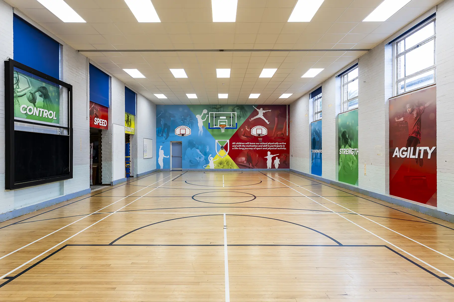 The School Sports Hall at Thomas A Becket Junior School offered lots of blank wall space that was perfect for Wall Art.